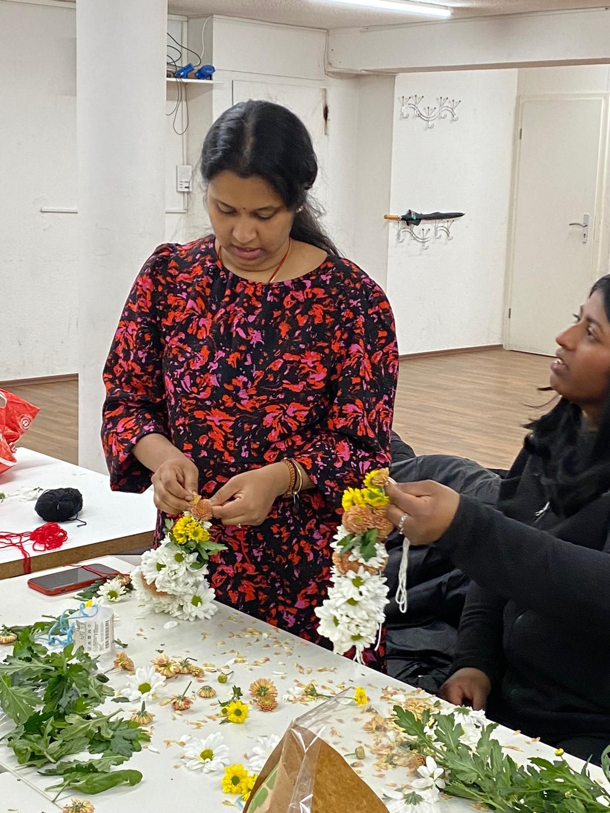 Blumengirlanden sind in der tamilischen Kultur fester Bestandteil sowohl religiöser Feste und Zeremonien als auch im familiären und alltäglichen Leben. Mit diesem Workshop möchte der Verein Tamilischer Künstler einen Einblick in diese lebendige Praxis geben. Teilnehmende lernen verschiedene Techniken des Girlandenbindens kennen, erfahren mehr über die kulturelle Bedeutung von Blumen im tamilischen Kontext und sind eingeladen, eigene Erfahrungen und Perspektiven einzubringen. Der Workshop schafft Raum für Begegnung, Austausch und gemeinsames Gestalten.
